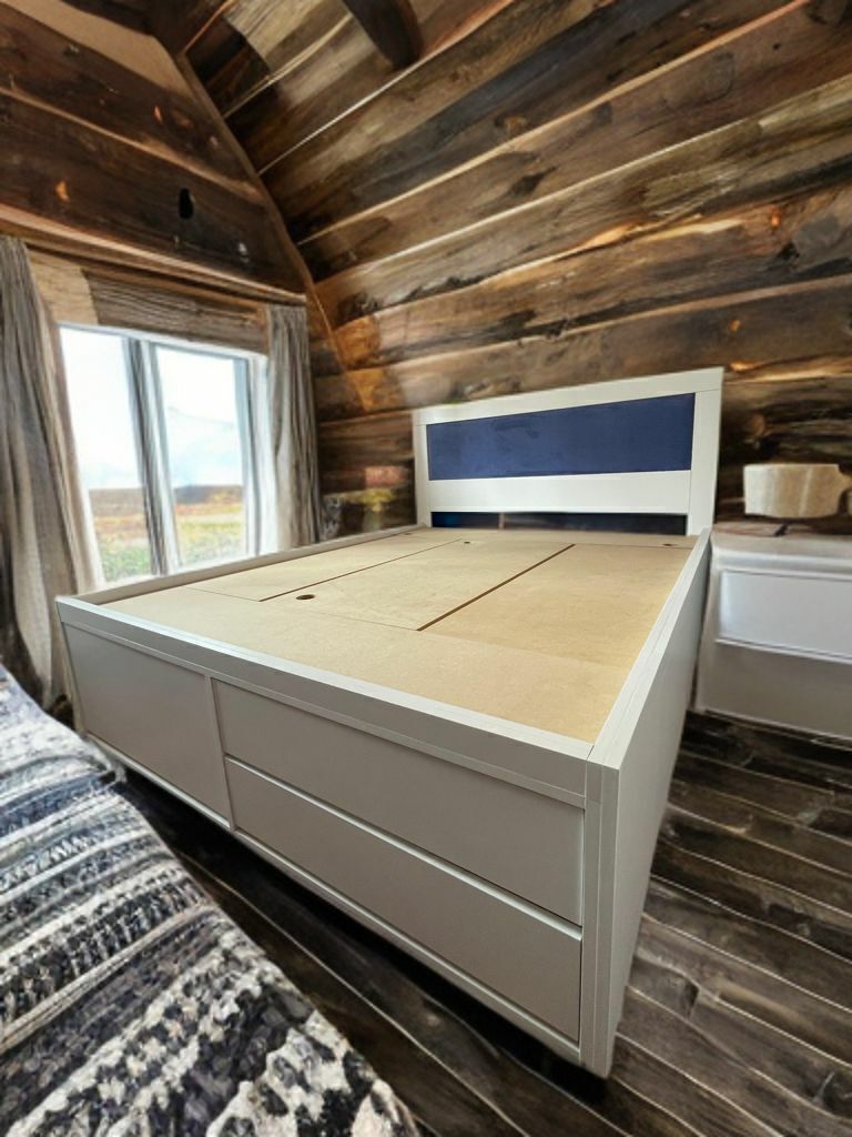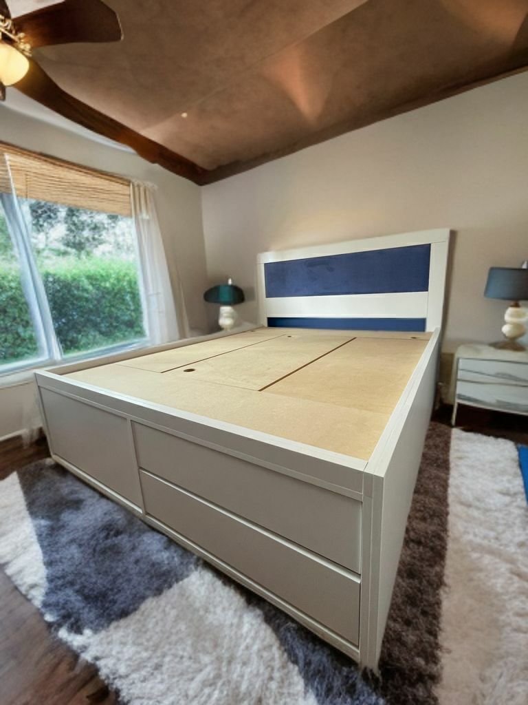 Fabricada en melamina de alta calidad, esta cama no solo es resistente, sino que también optimiza el espacio. Cada cajón y baulera ofrece un amplio almacenamiento para tus prendas y accesorios. Además, el colchón se aloja a 43 cm del piso, brindando una altura ideal para mayor comodidad.