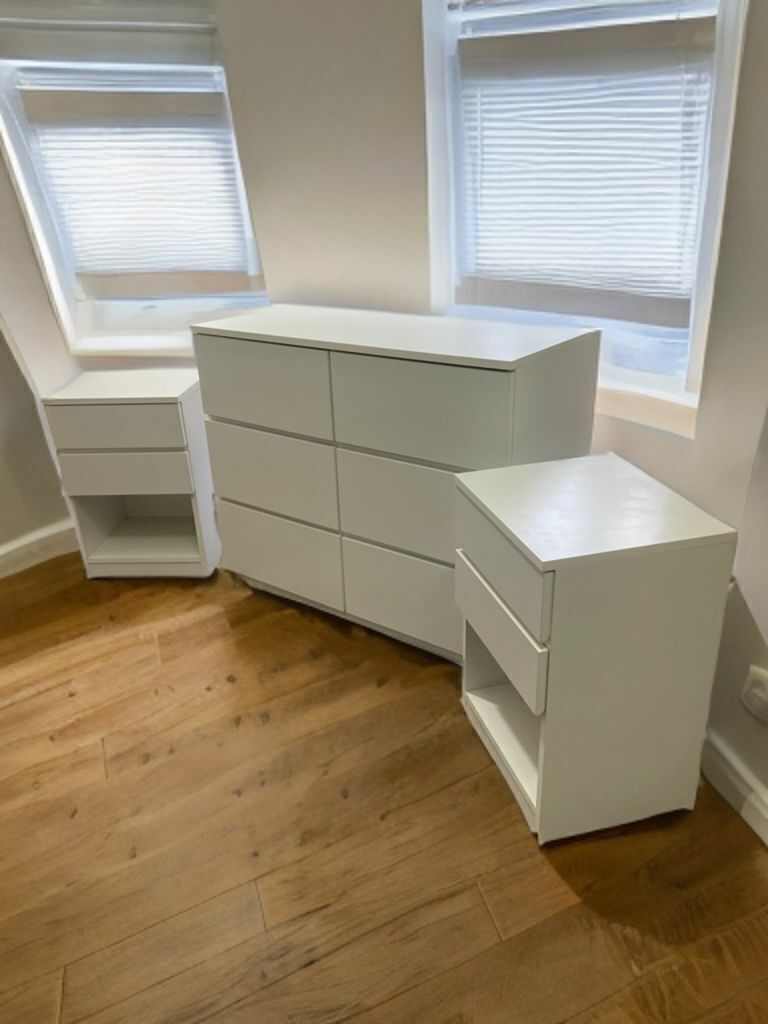 Este set combina funcionalidad y estilo, ofreciendo amplios cajones con correderas metálicas para un deslizamiento suave. Fabricado en melamina de alta calidad, garantiza durabilidad y elegancia.